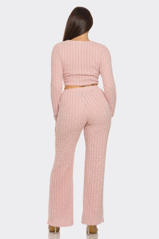 Wool fabric set: open front tie crop top + elastic waistband flare pants.